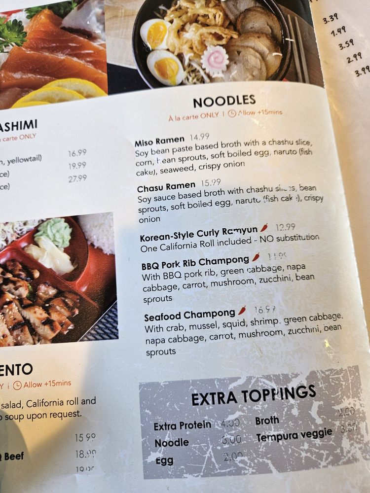 “ Came here for an order of salmon nigiri and the chashu ramen. The salmon was good, fairly standard. The chashu ramen with a soy sauce based broth was really yummy! Excellent ajitama and noodles. The pork belly was just good, not spectacular, but with the broth and other toppings, this was a delicious dish! Some of the better ramen in Reno, but I was sort of sad there wasn't any tonkotsu ramen. Kind of an odd environment, but it appears this may be due to renovations or moving things around. It's a bummer that you can't sit at the bar right now, but if you sit in the front section, you can still watch them making the sushi. Saw some sushi going out in wooden boats, which were adorable. Bare bones staff, so service is just a bit slow, but they clearly work their butts off, so it's OK. ”