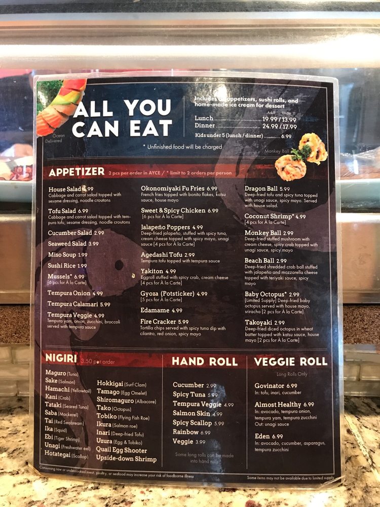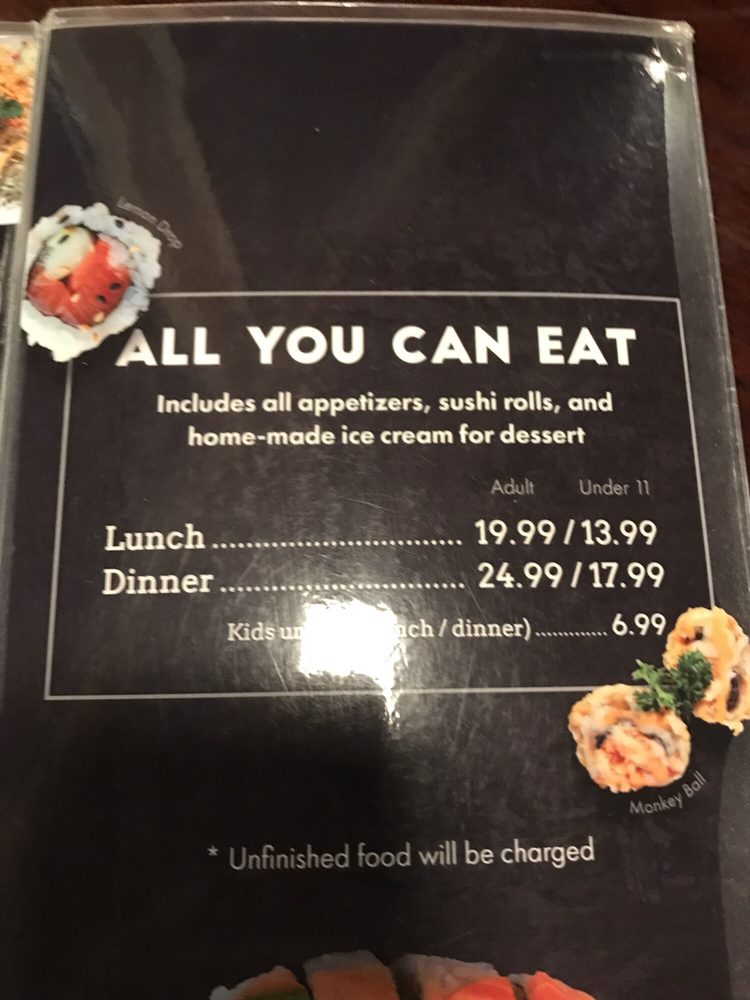 “ ~My second Sushi review~ Note: For groups of 4 or more they automatically add a 20% gratuity to the check (correct me if I'm wrong please) . Service for my partner and I was Excellent, our server was very thoughtful (young lady around her early 20s) . Our food tasted fresh and they do their portions just how I like it.... Lots of fish with a little bit of rice (regular rolls). I had been anticipating eating here for about a month and they didn't disappoint. Finally, I went around Lunch time so the room was quiet, the music is good, and I never felt rushed. Expect to pay around $70 for two people and all you can eat. I can't wait to go back!!!! ”