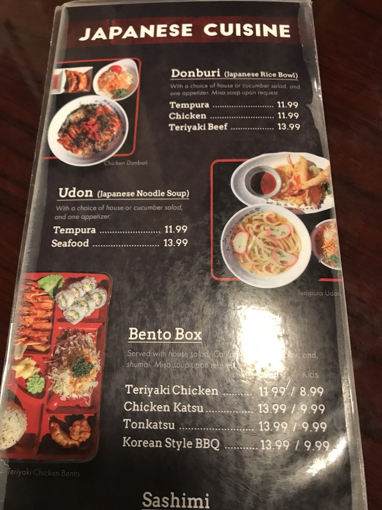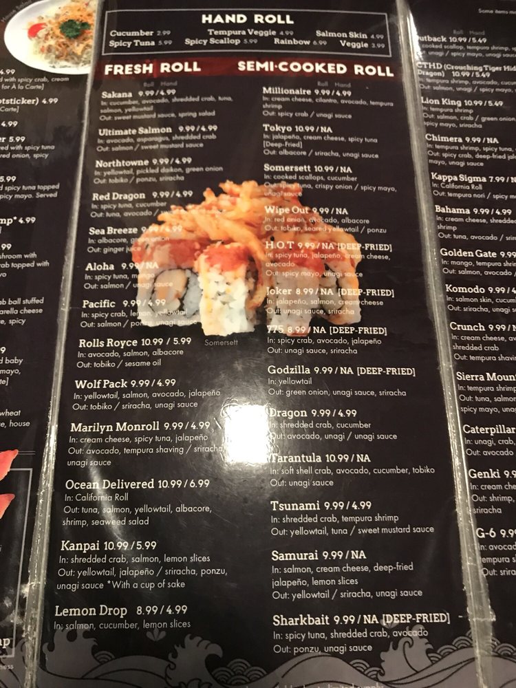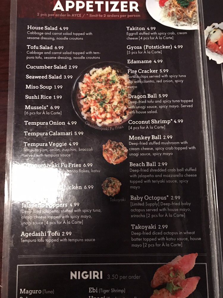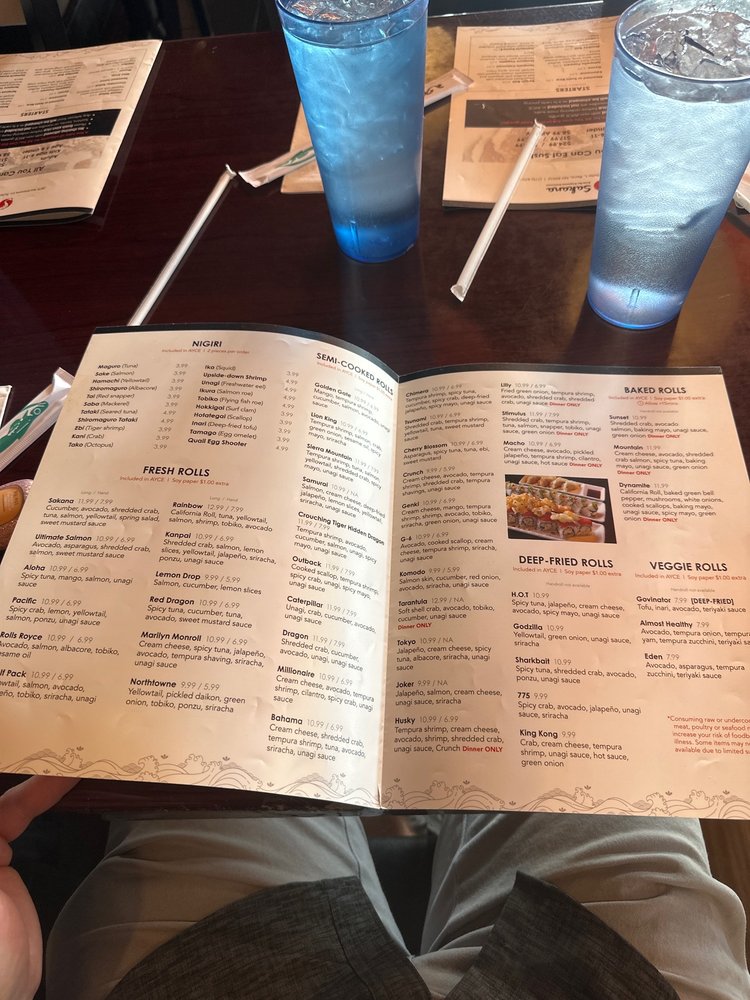 “ I came in after the gym to crush some lunchtime sushi by myself. I was sat at the bar, and right away my waitress was a bit distracted and walked away without getting me a menu. She did drop off an appetizer menu and I checked the seaweed salad. No worries, the sushi chef asked me right off the bat what type of fish I like, I said salmon, tuna, and yellowtail, and he got me a round of sashimi to get me eating. I told him I also love some unagi, and that popped up quickly as well. It wasn't until I'd already eaten much of the food he'd gotten me that he asked if I had a menu, then called for the waitress to hunt one down for me. She was apologetic, and I ordered green tea with her. I start ordering rolls from my chef, and he even pulls a roll out based on my previous interests. Banger! Love it. But eventually I have to flag down another waitress as I don't even have a water yet. I also hadn't been given my green tea or seaweed salad, and we're like 20min into service. New waitress gets me my water, and I'm still slamming awesome rolls from my man behind the bar. He's just killing it. I'm starting to slow down and my seaweed salad and green tea finally show up, and now the first waitress seems to be around more. At no point did I feel like the place was slammed, but I recognize that things happen. Ultimately, I loved the food. The salmon was such good quality, and each roll tasted distinct and was crafted effectively. I have to take a star off for the inconsistent service, something that you generally don't encounter when you're sitting at the bar, otherwise I'll be happy to come by again. ”